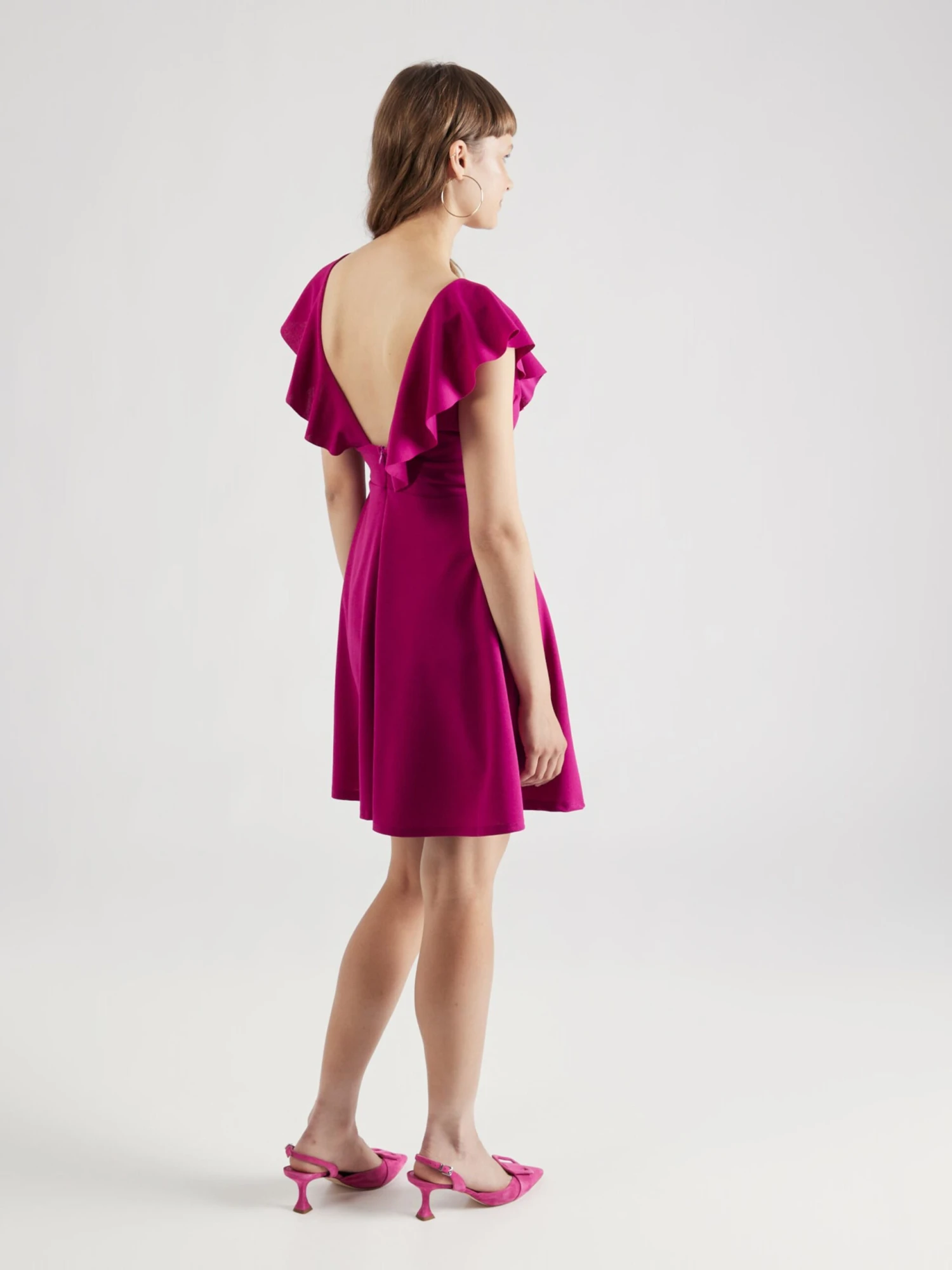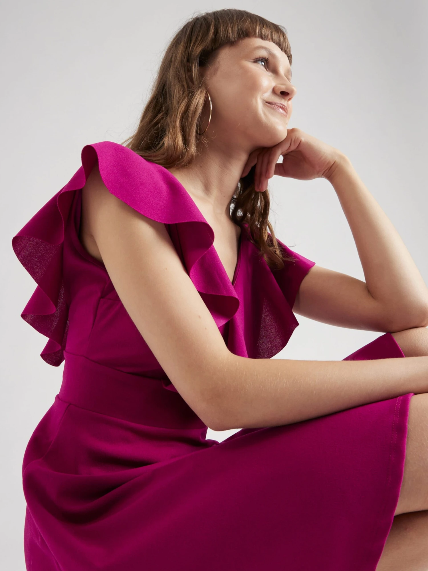 Couleur unieCol VVolantOurlet / bord surpiquéFermeture à glissière dorsaleBande à la tailleDécolleté profondDécolleté dans le dosCoutures ton sur tonTissu fluideFermeture à glissière