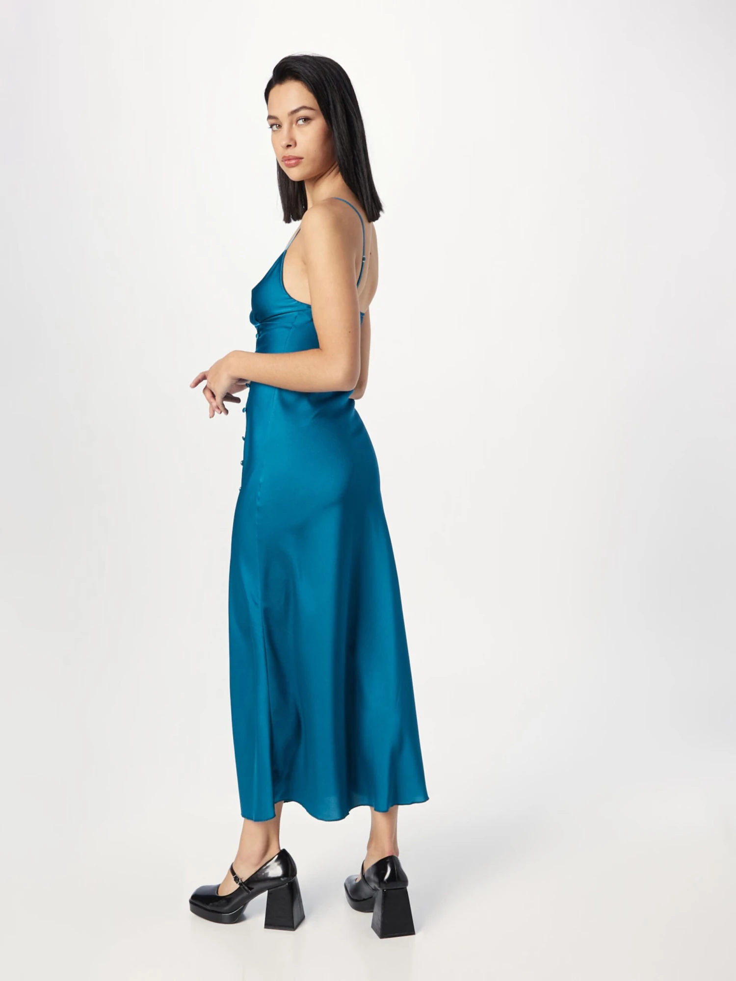 Couleur unieSatinBretelles spaghettiCol VDrapé / froncéCache-coeurFente au niveau de la jambeBoutonnièreDécolleté profondLanières réglablesCoutures ton sur tonFermeture à bouton